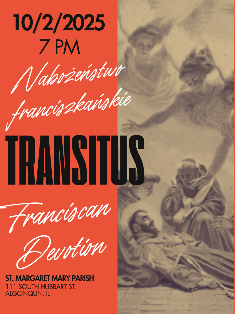 W czwartek 2 października zapraszamy na nabożeństwo transitus upamiętniające moment przejścia św. Franciszka z tego świata do wieczności. Nabożeństwo odbędzie się o godz. 7:00 PM.